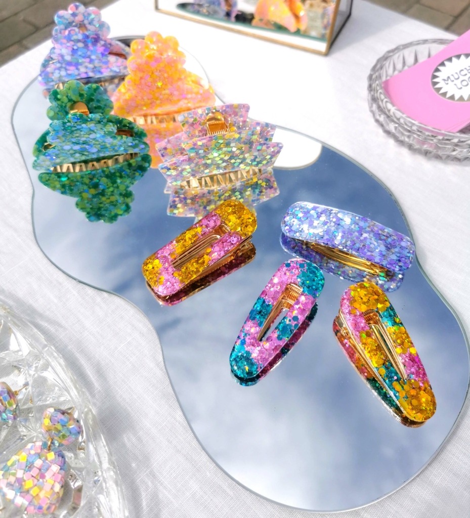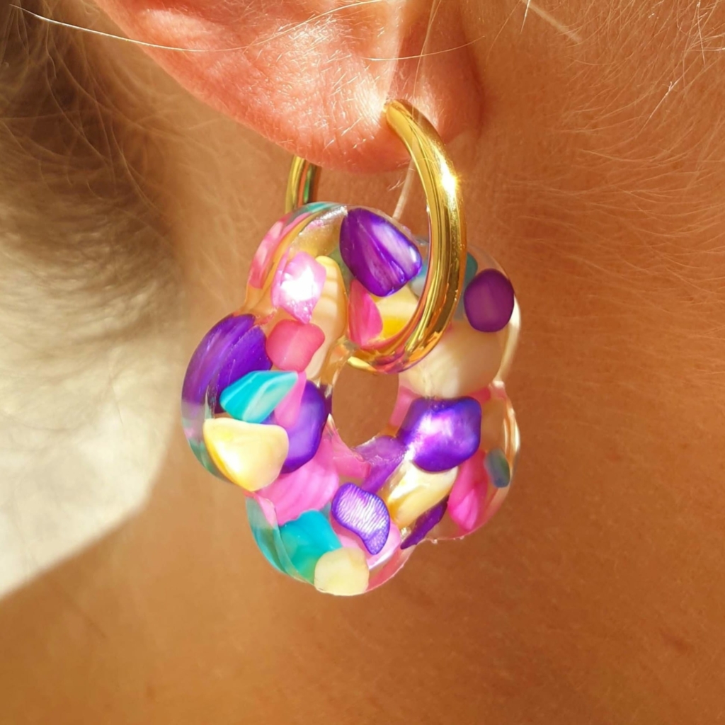 C’est dans cet esprit que naît peu à peu Mucha Loca. En Colombie, Charlotte expérimente la céramique, puis découvre la résine : un matériau vivant qui joue avec la lumière et laisse place à l’expérimentation. Elle y glisse fleurs séchées, pierres semi-précieuses, nacres, coquillages, paillettes ou strass… autant de fragments colorés emprisonnés dans la transparence.